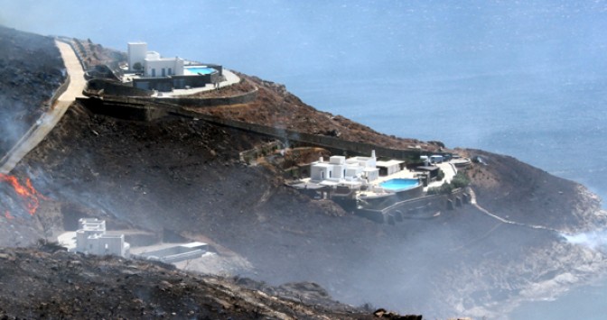 Στάχτη κινδύνευσαν να γίνουν οι πολυτελείς εξοχικές κατοικίες του υπουργού Οικονομικών Γιάννη Στουρνάρα και του πρώην υπουργού Γιάννου Παπαντωνίου στην περιοχή Τρία Λαγγόνια στο Νότιο άκρο της Σύρου.